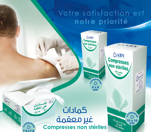 La compresse non-stérile ABN MEDICAL  purifiée,  aérée ,tissée en pur coton, hydrophile, avec une bonne perméabilité à l’air.